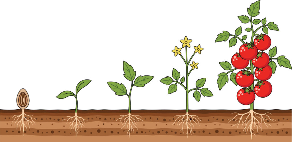 Når planten kommer opp av jorda, vokser det ut stengel og blad.