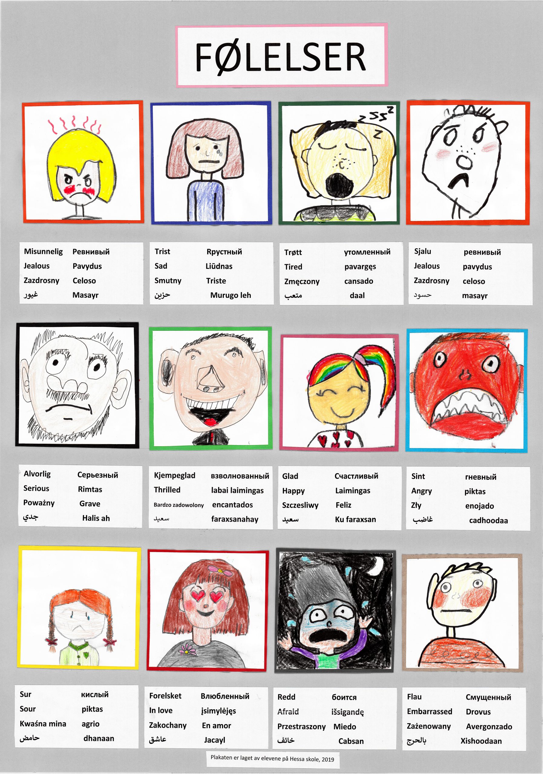 Elevene ved Hessa skole har laget tegningene. Under tegningene er det satt ord på følelsene på arabisk, engelsk, litauisk, norsk, polsk, russisk, somali og spansk.