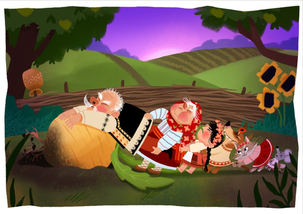 Det var en gang en familie som bodde på en gård i en liten landsby. På gården bodde bestefar Androshka, bestemor Maroshka, barnebarnet Minka, hunden Finka, katten Varvarka og musen Siromanka.