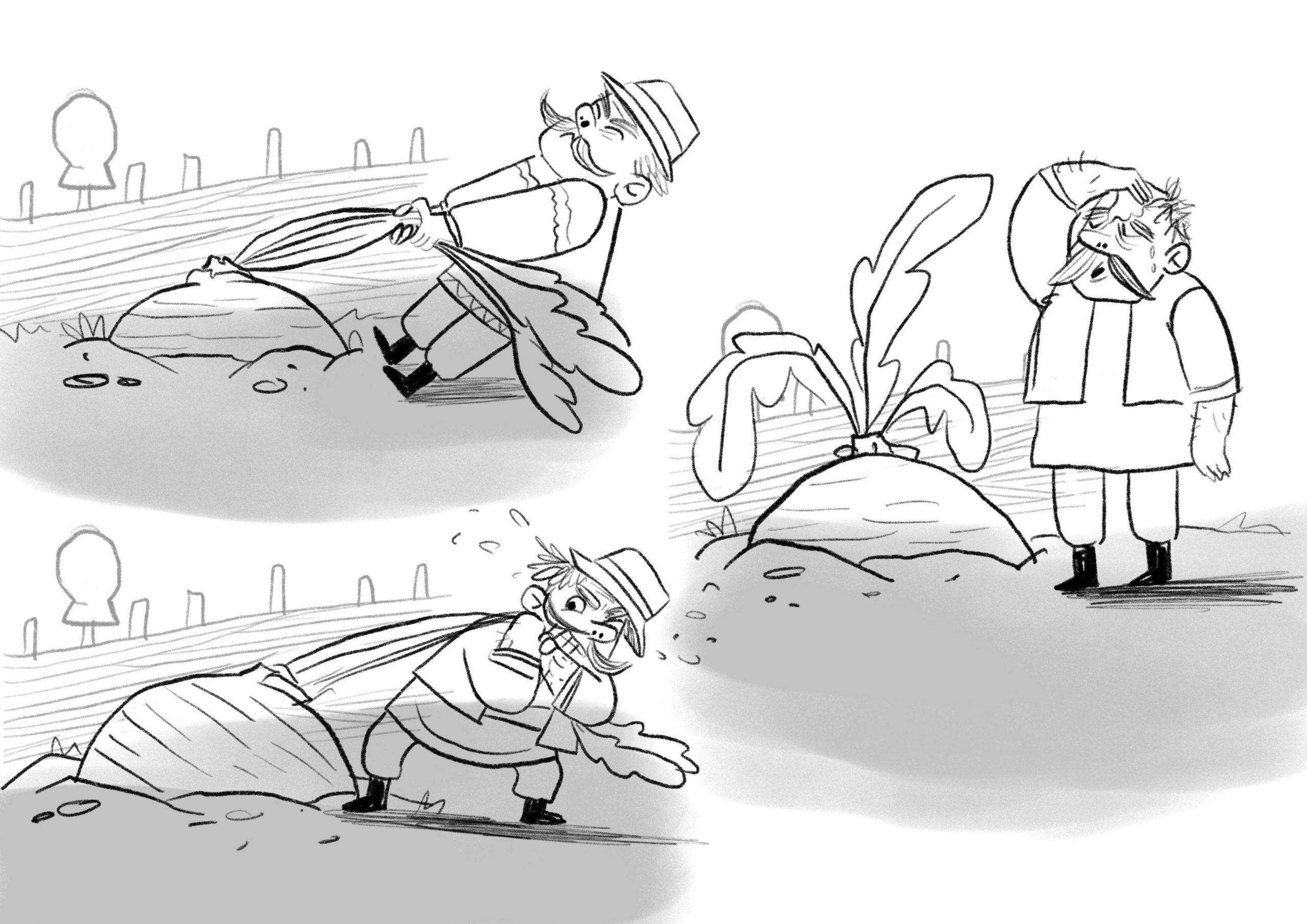 Bestemor kom så fort hun kunne. Bestefar Androshka tok tak i nepen og bestemor Maroshka tok tak i bestefars skjorte, og så dro de alt de kunne. De dro og dro, men den gigantiske nepen satt fortsatt bom fast i bakken.