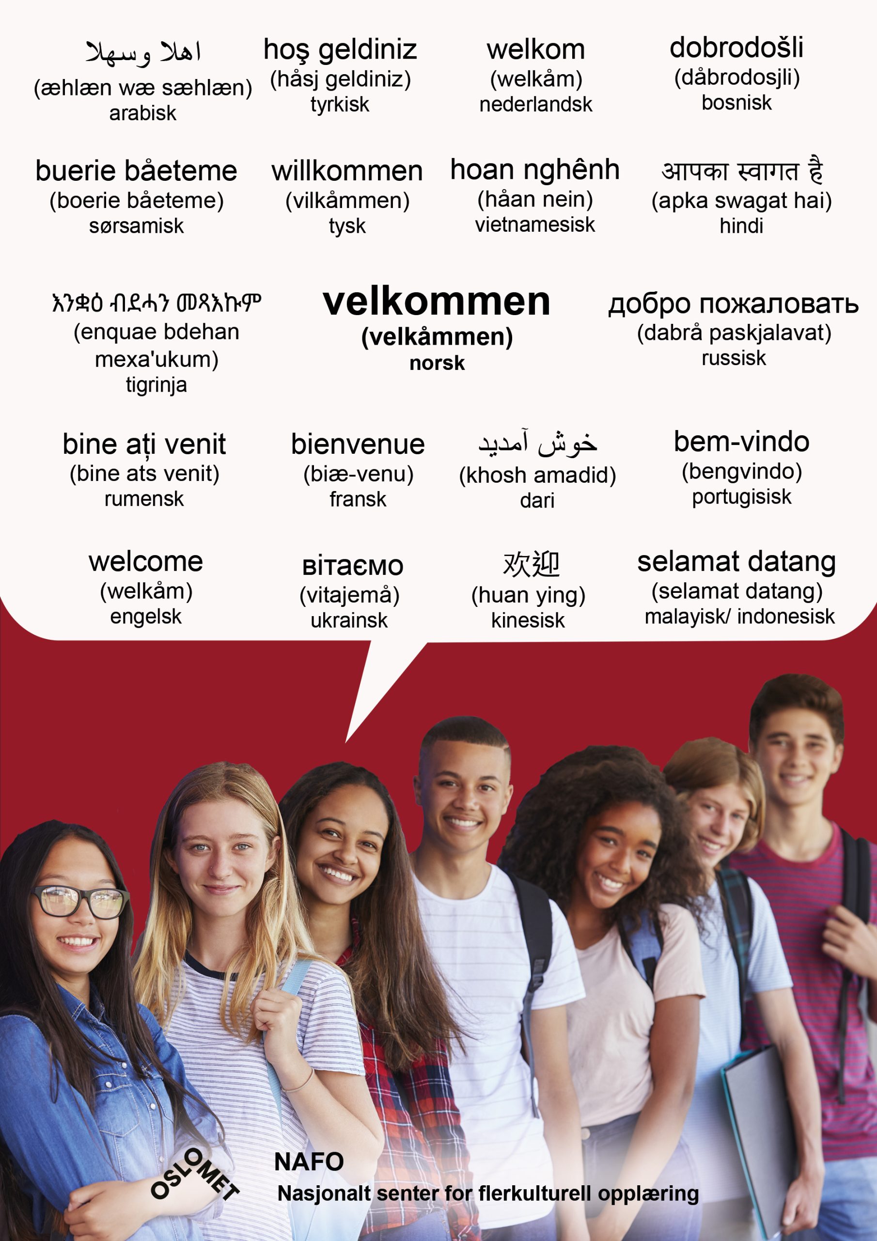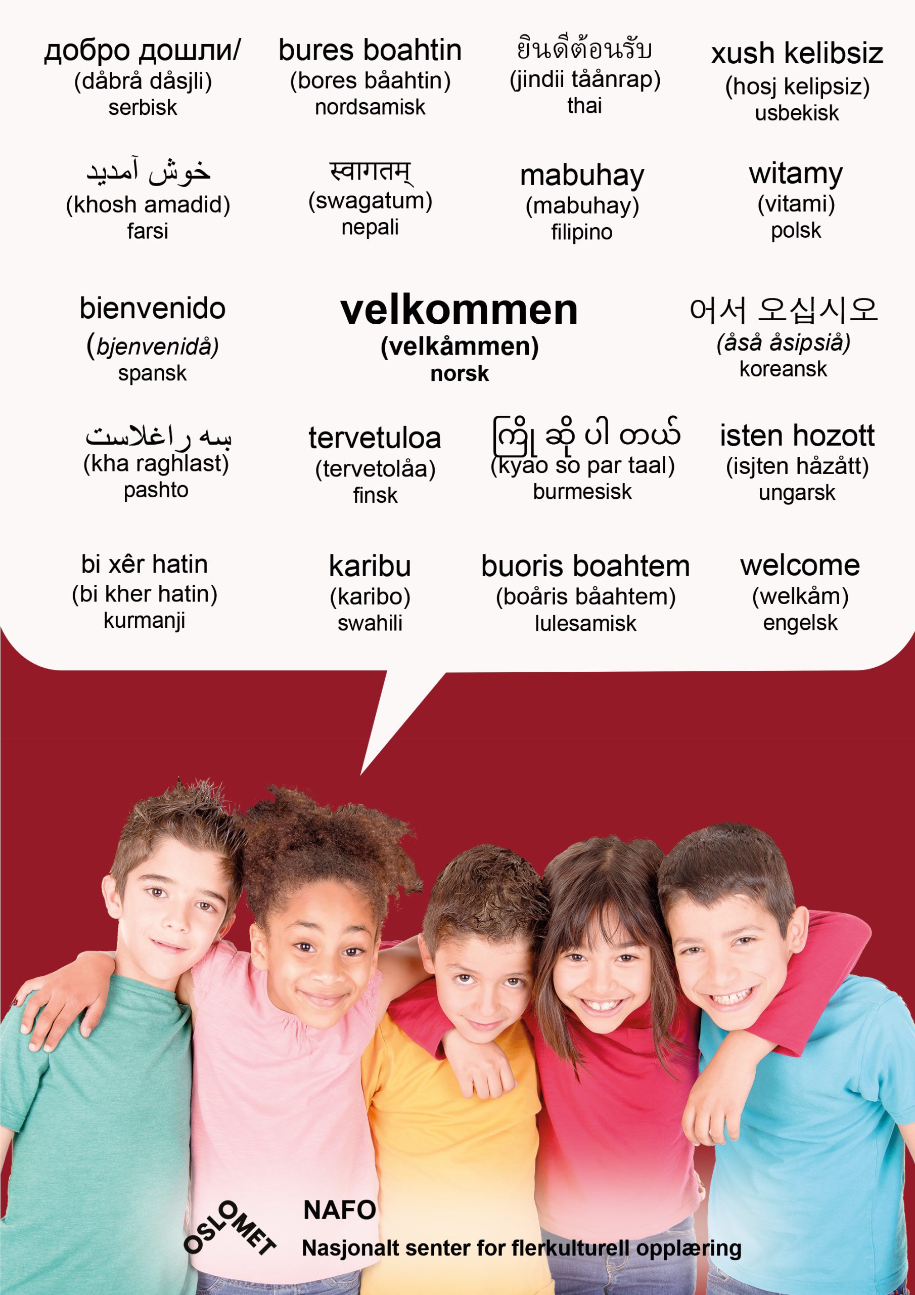 Foto: AdobeStock/ NAFOSi velkommen til barn, elever, foreldre, besteforeldre, tanter eller onkler på flere språk. NAFO har laget to plakater med ordet VELKOMMEN på mange språk. Det er forskjellige språk og bilder på plakat nr.1 og 2.
